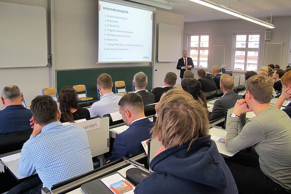 In ihrem Pitch berichteten Personalverantwortliche, Direktoren und Projektleiter von unter anderem bauplanung plauen gmbh, Brunel GmbH und CG GRUPPE AG, Eiffage Rail und GP Papenburg Hochbau GmbH, welche Aufgaben und Projekte ihre Unternehmen derzeit zu bewältigen haben und welche Einstiegsmöglichkeiten für junge Leute existieren. Anschließend diskutierten sie mit den Studentinnen und Studenten darüber, was Firmen von Bewerbern und zukünftigen Mitarbeitern erwarten. Köster GmbH, Ludwig Pfeiffer Hoch- und Tiefbau GmbH & Co. KG sowie Schweerbau GmbH & Co. KG waren ebenfalls vertreten und ließen in ihren Bewerbungsprozess blicken. Dabei kamen auch Fragen dazu auf, welchen Stellenwert ein Anschreiben gegenüber einem Lebenslauf besitzt, ob bzw. wie ein Interessent die eigenen Gehaltsvorstellungen ansprechen sollte und welche Studienabschlüsse von zukünftigen Arbeitgebern gewünscht werden.