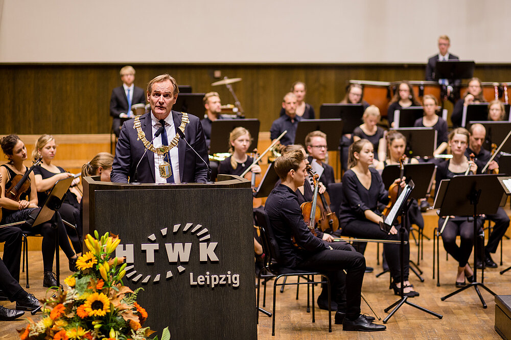 Burkhard Jung, Oberbürgermeister der Stadt Leipzig und Mitglied des Hochschulrates der HTWK Leipzig, warb für das Studium als „Zeit voller Erfahrungen, mit Menschen, die für Ihre Sache brennen und diese Begeisterung an die Studierenden weitergeben“. Er rief diese auf, sich auch neben dem Studium zu engagieren, in den gesellschaftlichen Diskurs einzubringen und den Herausforderungen unserer Zeit zu stellen.