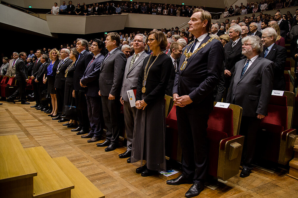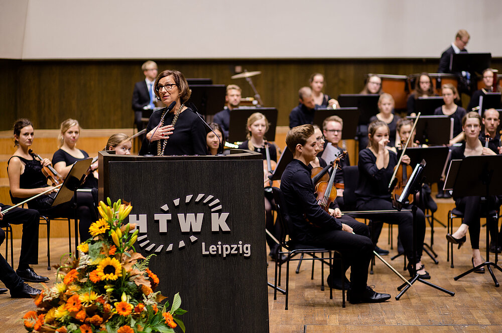 Nach dem feierlichen Einzug des Senats begrüßte HTWK-Rektorin Prof. Gesine Grande die neuen Studierenden – die Erfolgreichen der insgesamt etwa 10.000 Bewerber und Bewerberinnen, von denen es letztlich 7.200 ins Auswahlverfahren geschafft hatten. „Sie sind bei uns gut aufgehoben“, versprach die Rektorin. Die Vision der Hochschule sei es, „dass wir Ihnen das Rüstzeug vermitteln, damit Sie sich nach Ihrem Studium selbstbewusst und selbständig weiterbilden und weiterentwickeln, Ihr Berufsfeld bei Bedarf neu erfinden und immer wieder über sich hinauswachsen können.“