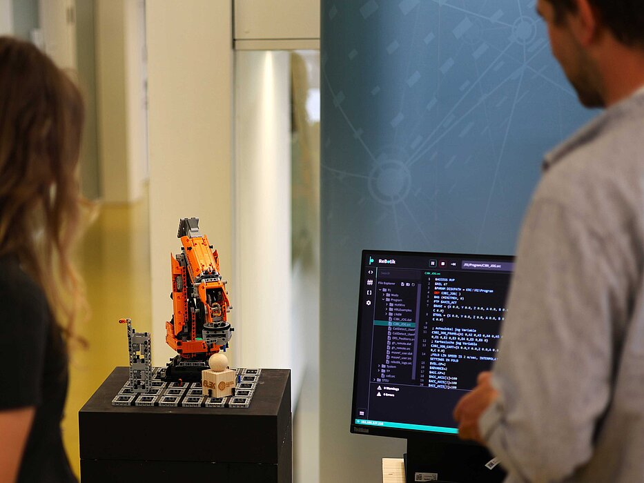Im Kern des aus handelsüblichen Klemmbausteinen zusammengesetzten Roboterarms läuft das Betriebssystem seines großen Bruders aus Metall. So können Funktionsweise, Koordinatenbezüge und Programmierung von Industrierobotern leicht und gefahrlos vom Schreibtisch aus erfahren und ausprobiert werden. In engem Austausch mit dem FLEX-Team rund um Prof. Alexander Stahr entwickelt ReBotik, ein Start-up von drei HTWK-Studenten, eine Mensch-Maschine-Schnittstelle (HMI) zur Programmierung und Steuerung der Roboter über eine Webanwendung.