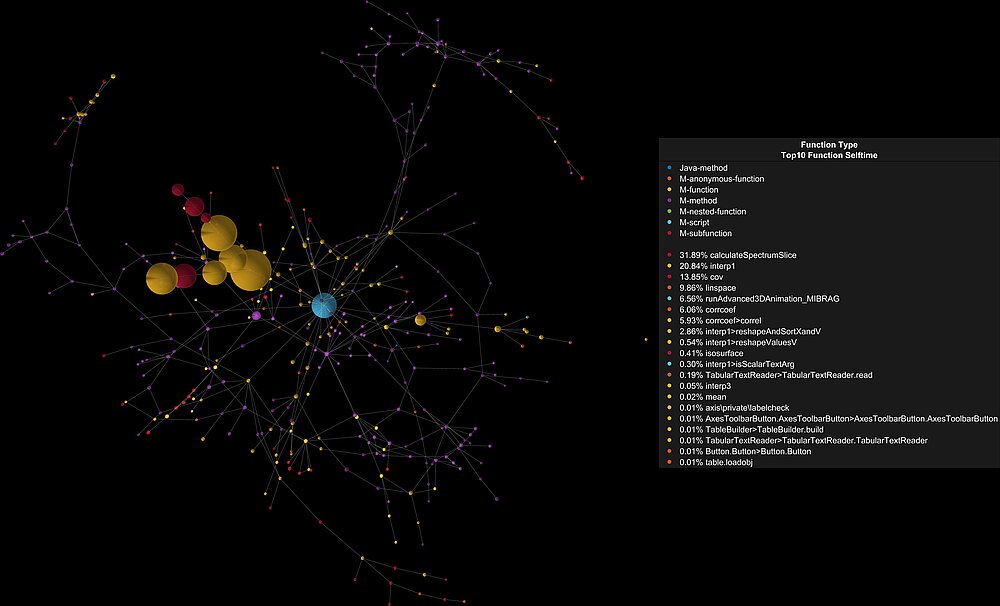 Mithilfe eines kraftgerichteten Layout-Algorithmus ordnet das Skript dieses Netzwerk im 3D-Raum an, sodass die inhärente Struktur des Codes organisch zum Vorschein kommt. Die resultierende Visualisierung stellt Funktionen als Kugeln dar, deren Volumen direkt proportional zu ihren Rechenkosten (SelfTime) ist und deren Farbe den Funktionstyp angibt.