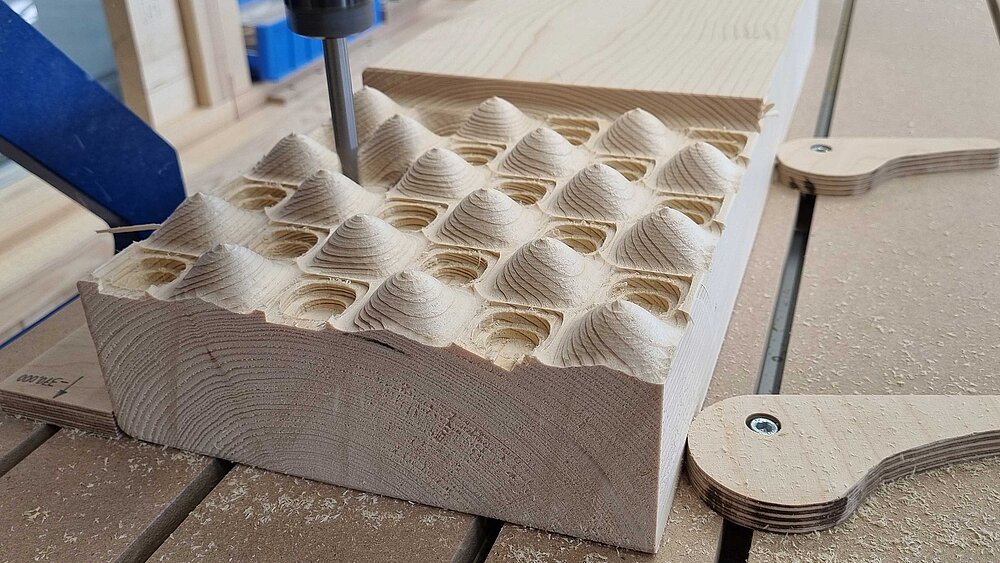 Das abgebildete Foto zeigt einen Moment im Herstellungsprozess eines Prüfmusters, bei dem die CNC-Fräse eine Holzoberfläche nach einem parametrischen Modell bearbeitet. Neben seinem Masterstudium im Bauingenieurwesen arbeitet Körfgen als wissenschaftliche Hilfskraft in der Forschungsgruppe FLEX an der HTWK Leipzig an einem weiterführenden Projekt, das sich mit dem untersuchten Verbindungskonzept befasst.