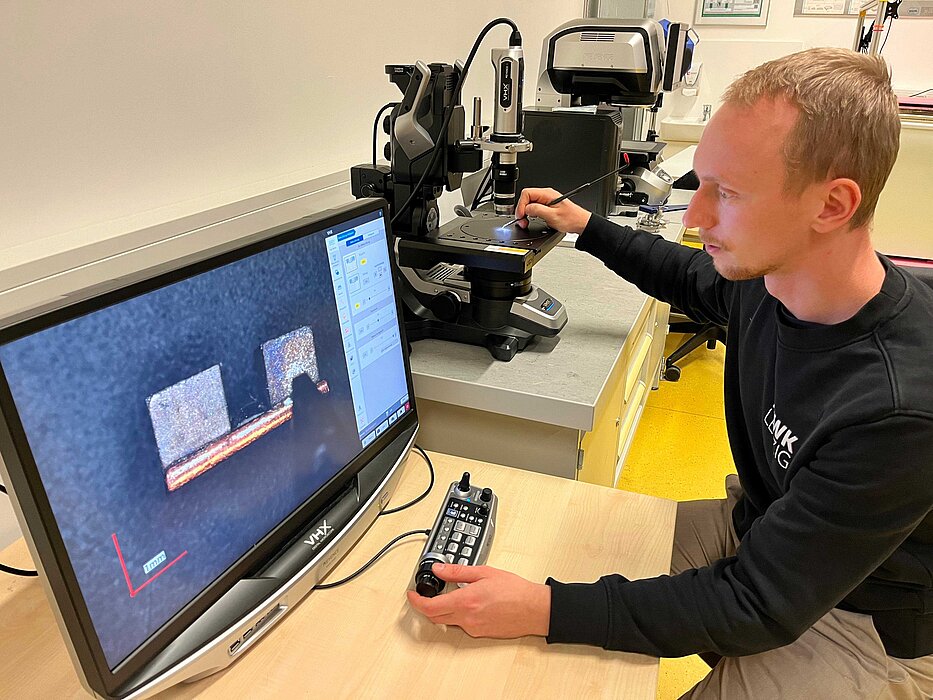 | Auf dem Bildschirm des Mikroskops werden zwei 50-fach vergrößerte Bismuttelluridwürfel abgebildet, die auf einer Kupferplatte verlötet sind. 127 dieser Baugruppen ergeben ein Peltier-Element, welches aufgrund der außergewöhnlichen thermoelektrischen Eigenschaften des dotierten Bismuttellurids für Kühlprozesse eingesetzt werden kann. In meinem Masterprojekt des Masterstudiums Maschinenbau bei Prof. Dr. Mathias Rudolph und Maik Wolf hat sich Leonhard Gehlauf, der auf dem Bild zu sehen ist, mit der thermischen Optimierung dieser Peltier-Elemente beschäftigt.