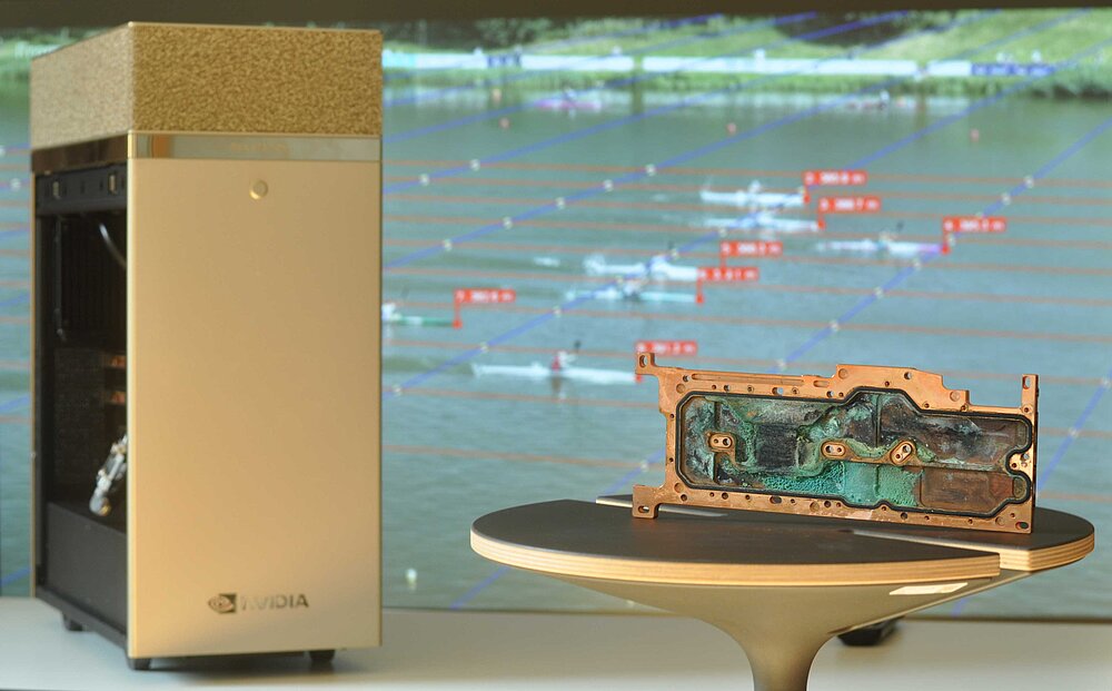 Links im Bild ist eine DGX-Station von NVIDIA zu sehen, ein Hochleistungsrechner für das Training und die Ausführung künstlicher neuronaler Netze. Rechts liegt der Kühlkörper einer der vier Grafikkarten des Systems, der deutliche Spuren intensiver Nutzung zeigt. Im Hintergrund läuft ein von der Software zur Wettkampfanalyse erzeugtes Video, das die automatisch erkannte Bootspositionen im Rennverlauf visualisiert.
