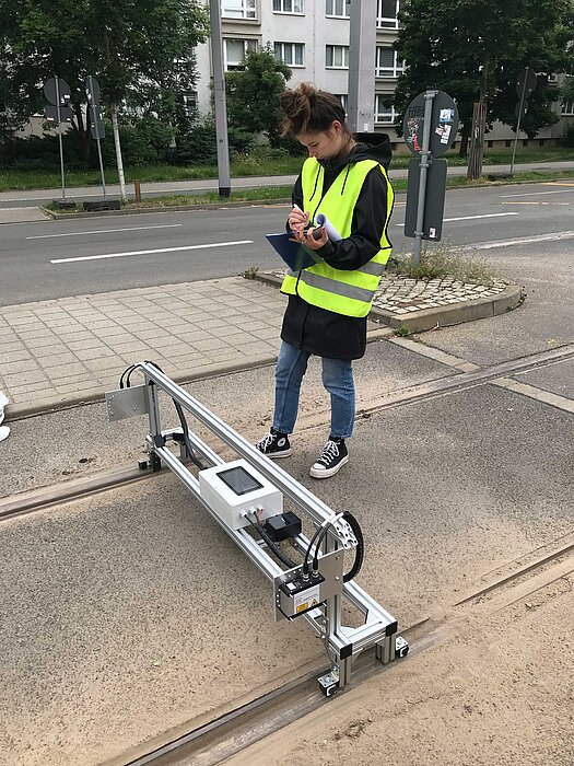 Im Bild ist Frau B. Eng. Elena Richter bei der Durchführung einer Messkampagne im Straßenbahngleis der Leipziger Verkehrsbetriebe zu sehen. Im Rahmen ihrer Masterprojektarbeit erforscht sie mithilfe von KI-Methoden Schienenfehler. Die Besonderheit dieses realitätsnahen Bildes besteht einerseits in der Abbildung einer jungen Wissenschaftlerin bei der Durchführung stark MINT-geprägter Forschungsarbeiten. Zudem zeigt dieses Bild in hervorhebenswertem Maße die routinemäßig wirkende Forschungsarbeit, die von fundamentaler Bedeutung ist, um konsistente Forschungsziele zu erreichen und gesellschaftlich wirksame Innovationen zu liefern.