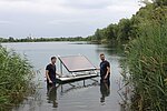 | Das Bild zeigt die Erprobung eines neuartigen schwimmenden Photovoltaiksystems, bei dem ausgediente Windkraftrotorblatt-Segmente als Schwimmkörper wiederverwendet werden. Diese innovative Idee verbindet Kreislaufwirtschaft mit nachhaltiger Energiegewinnung: Materialien ehemaliger Windenergieanlagen erhalten ein zweites Leben als Trägerstruktur für Solarmodule auf Gewässern. Durch die natürliche Kühlung des Wassers steigt der Wirkungsgrad der Module, während gleichzeitig Landflächen geschont werden. Aus dieser Forschung ist ein gefördertes Validierungsprojekt an der HTWK Leipzig hervorgegangen, das die wirtschaftliche Umsetzung und Skalierung dieser Technologie untersucht – ein Schritt hin zu einer zirkulären, ressourceneffizienten Energiewende.